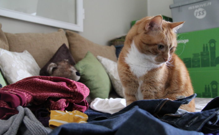 Kaiken keskelle kävellä keinuttelee kissa. Elegantein askelin se ottaa tilan haltuun, hyppää sängylle. Istahtaa tyynesti hikisten sukkien ja paitamyttyjen, pesuun pyrkivien farkkujen ja rypistyneiden mekkojen sekaan. Katselee hetken ympärilleen ja alkaa sitten pestä kauniisti kaareutuvaa tassuaan.