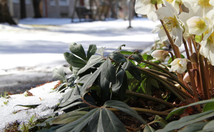 Tänään päätin olla luovuttamatta, vaikka ärsytti. Lampsin saappaissani rappuset ylös ja pengoin kameran muistikortin esiin, palasin pihaan ja katsoin linssin läpi jouluruusuani. Eilen se oli nauranut kilpaa auringon kanssa, yöllä peittynyt osin lumeen. Nyt seinustalle paistoi ja lämpö sulatti kylmiä kerroksia kasvien päältä.  Jouluruusuni oli yhtä hymyilevää kukkamerta, vaikka osa sen lehdistä taipui vielä lumen alle.