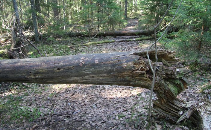 Kuljen hiljaa ihmetellen vihreää syliä, kun kulkuni tyssää. Polun yli on kaatunut puunrunko, toinen, kolmas ja vielä neljäskin. Osa helposti kierrettäviä, osa ei. Kiukuteleva polveni on ollut köhän takia viikon liikkumatta eikä tahdo taipua kiipeämiseen. En voi tietää, mitä mutkan takaa löytyy. Voi olla, että kulku käy helposti ja esteettä. On kuitenkin myös mahdollista, että vastaan tulee tätäkin pahempi rytö ja suma.